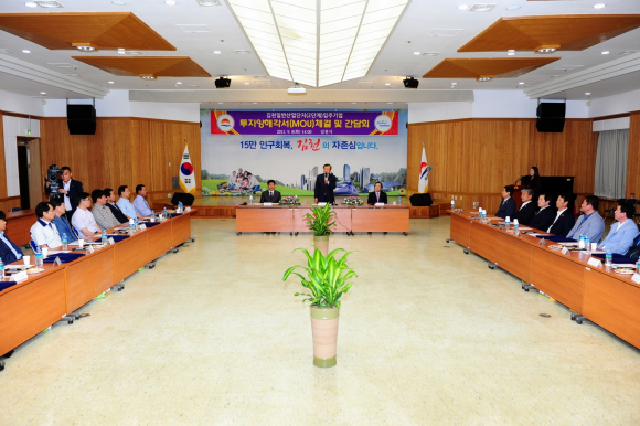시는 일반산업단지(2단계) 52개 분양업체중 우선 입주업체 대표자 30명과 김정호 김천상공회의소 회장 등 40여명이 참석한 가운데 간담회 및 투자양해각서(MOU)를 체결했다. 이번 간담회는 입주업체의 애로사항을 사전 해결하고, 투자양해각서체결로 향후 투자계획을 구체화하여 실질적인 투자를 이끌어내기 위한 자리로 이번 협약을 통하여 2,200억원의 투자규모와 1,700여명의 신규 일자리 창출로 지역경제 활성화에 크게 도움이 될것으로 기대한다.