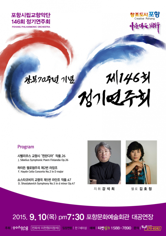 이번 연주회는 경술국치일로부터 35년에 가까운 기간 동안 국권침탈의 아픔에서 해방의 기쁨을 맞이한 광복 제70주년을 기념해 기획된 공연으로, 섬세한 지휘와 곡에 대한 탁월한 해석력의 진면모인 마에스트로 강석희와 명확한 악곡 해석을 통한 호소력 짙은 연주를 들려주는 협주자 첼리스트 김호정과 포항시립교향악단의 환상적인 하모니로 이뤄진다.