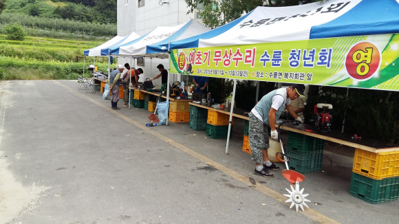 수륜면 청년회(회장 장익봉)에서는 9월 11일부터 9월 13일까지 회원 30여 명이 참가하여 수륜면 소재지 복지회관 옆 공터에서 수륜면을 방문하는 벌초객과 면민을 대상으로 고장난 예초기에 대하여 무상수리를 한다.