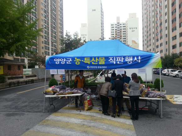 문화관광과(과장 이영우)는 수확의 계절 가을을 맞아 영양군 농산물의 판로를 개척하고자 2015년 9월 17일 대구광역시 달서구 성서 한샘타운 단지에서 농·특산물 직판행사를 실시하였다. 이번 행사는 문화관광과 직원, 일월면 곡강리 박○○씨, 석보면 요원리 김○○씨 농가가 참여하여 농·특산물의 홍보 및 직판행사를 추진하였다.
