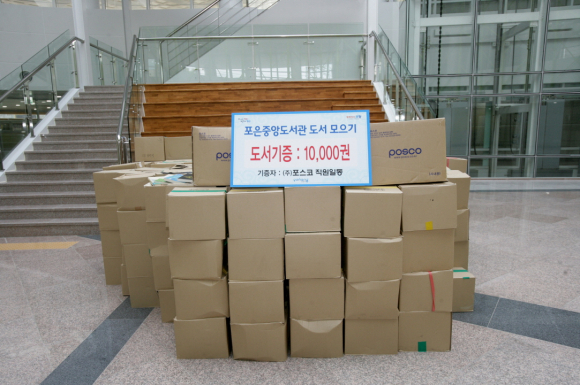 포스코는 지난 6월 포항시와 포스코간의 범시민 도서모으기를 위한 협약 체결 후 직원들과 함께 도서 모으기 운동을 벌여왔다. 3개월 가량의 도서 모으기를 실시한 결과 가정과 사무실에 잠자고 읽는 양질의 도서 1만여권을 모아 16일 포은중앙도서관에 전달했다.