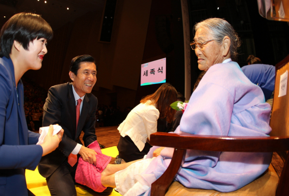 이어, 호스피스 병동 자원봉사로 10년간 생명사랑 봉사활동을 실천한 강영상(83세) 어르신, 배움의 열정으로 노인복지회관 라인댄스, 기타, 컴퓨터반 최고수강생인 안석호(86세) 어르신, 건강한 모습으로 노인일자리에 참여하는 류동호(92세) 어르신 등 지역의 존경스러운 5명의 어르신에 대한 세족식이 경건하게 진행됐다.