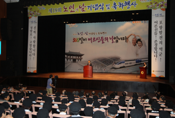 포항시는 2일 포항문화예술회관에서 포항향토청년회(회장 안석호) 주관으로 ‘활기차고 아름다운 노년의 행복’이라는 슬로건 아래 제19회 노인의 날 기념식 및 축하행사를 개최했다.