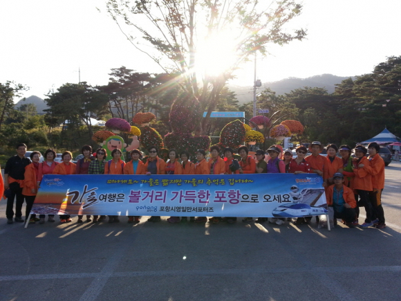 포항시 영일만서포터즈(회장 임미숙) 회원 100여명이 지난 5일 경북 문경군 가은촬영장과 충북 괴산군 산막이 옛길을 방문해 관광객들을 대상으로 포항 홍보활동을 펼쳤다.