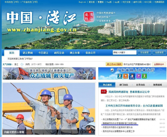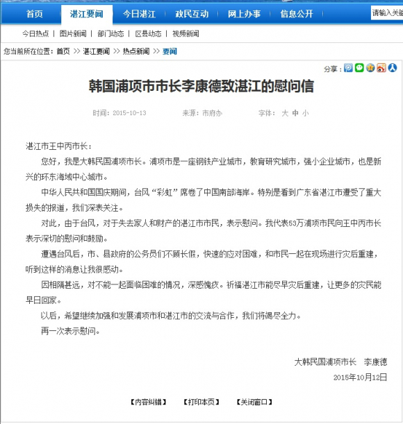 중국 잔장시정부, 이강덕 포항시장 위로서한문 홈페이지 게재