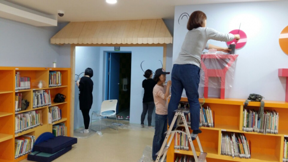 이날 자원봉사자들은 다소 밋밋했던 자료실 벽면에 아이들이 좋아하는 꽃과 동물, 마을풍경의 그림을 그려 넣어 밝고 따뜻한 공간을 연출했다.