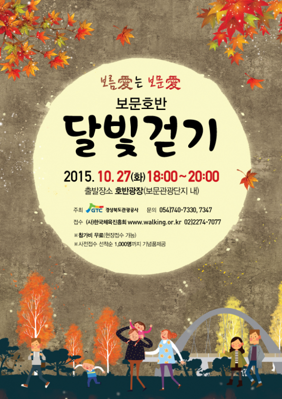 경상북도관광공사(사장 김대유)는 오는 27일 가을빛으로 물든 경주 보문관광단지에서 ‘보름愛는 보문愛’보문호반 달빛걷기 행사를 개최한다.