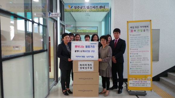 파리바게트 성주지점(대표 : 신성옥)에서는 10월 22일, 관내 드림스타트 저소득층 60가구에 전달해 달라며 롤케익 60점(싯가 60만원 상당)을 기탁했다. 신성옥 파리바게트 성주지점장은 “개점 10주년을 맞이하여 관내 어린이들과 함께 뜻깊은 날을 기념하기 위해 이런 자리를 마련했으며 아이들이 건강하고 밝게 성장하기 바란다.”며 따뜻한 마음을 전해왔다.