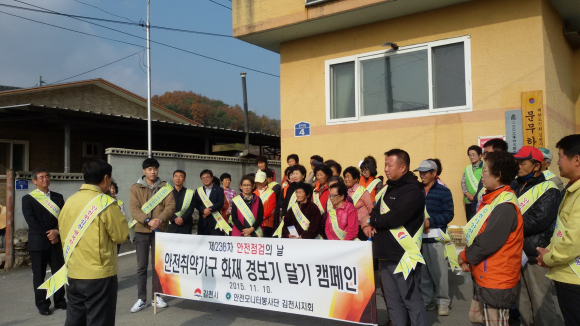 김천시(시장 박보생)는 지난 10일 감문면 문무리에서 안전모니터봉사단원들과 함께 농촌지역의 생활안전을 담보하기 위하여 80가구에 화재경보기 달아주기 행사를 진행했다.