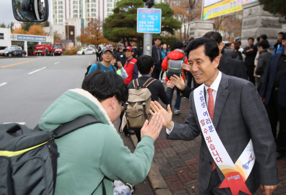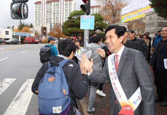 이강덕 포항시장이 12일 2016학년도 대학수학능력시험장인 제철고등학교를 찾아 시험장에 들어서는 수험생들과 일일이 하이파이브를 하고 응원의 메시지를 전달하며 격려를 아끼지 않았다.