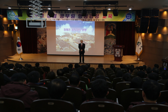이날 강의를 맡은 정임수 강사(전 고령서장)는 “청렴은 공직자의 생명”이라는 주제로 ‘비리발생 주요 사례’와 ‘청렴성 제고 사례’를 통해 공직자가 갖추어야 할 청렴정신에 대해 교육을 실시하였다.