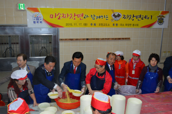 포항교도소(소장 문병일)는 ‘15. 11. 17.(화) 미소 짜장면 봉사회의 후원을 받아 전 수용자에게 짜장면 1,350그릇(290만원 상당)을 점심으로 지급하는 뜻 깊은 행사를 가졌다.