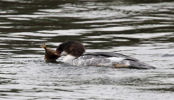 17일 오후 포항시 남구 연일읍 형산강변에서 겨울철새 비오리 한 마리가 강도다리 사냥에 성공해 물위를 떠다니고 있다.