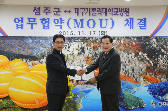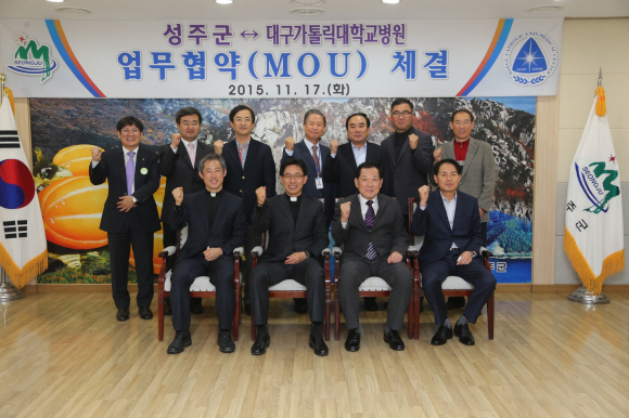 성주군(군수 김항곤)은 11.17(화) 군청 소회의실에서 대구가톨릭대학교 병원 최경환 의료원장을 비롯한 병원관계자가 참석한 가운데 업무협약을 체결하였다.