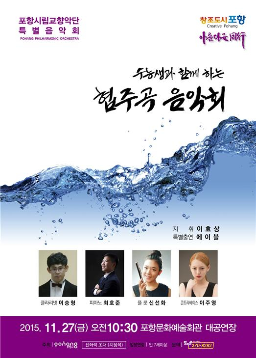 포항시립교향악단(예술단장 이재춘 부시장)은 27일 포항문화예술회관 대강당에서 수험생과 함께하는 협주곡 음악회를 개최한다.