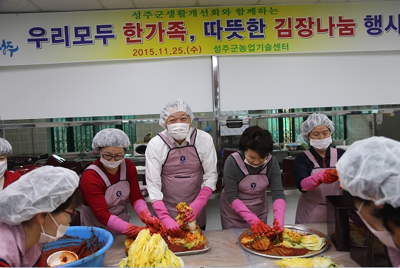 한국생활개선성주군연합회(회장 이경희)에서는 11월 25일 회원 50여명이 참석한 가운데 성주군농업기술센터에서 읍면 소외계층과 독거노인 등에 나누어 줄 김장김치 담그기 행사를 개최하였다.