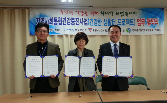 포항시 북구보건소가 26일 학산종합사회복지관 및 창포종합사회복지관 회의실에서 관계자 등 10여명이 참석한 가운데 학산주공 및 창포주공아파트의 건강한 생활터 만들기 프로젝트 활성화를 위해 종합사회복지관 및 주택관리공단과 ‘5NO․5YES 건강한 생활터 만들기 프로젝트’ 업무협약을 체결했다.
