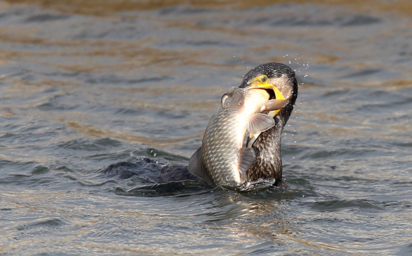 3일 오후 포항시 남구 연일읍 형산강에서 먹이 사냥에 나선 가마우지가 제 몸집만한 먹잇감을 잡기 위해 안간힘을 쓰고 있다.