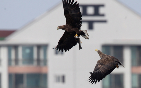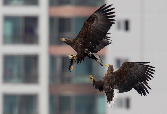 5일 포항시 남구 연일읍 형산강에서 멸종위기동물 1급이자 천연기념물 243-4호인 흰꼬리수리가 사냥한 물고기를 다른 흰꼬리수리가 뺏으려 하고 있다.