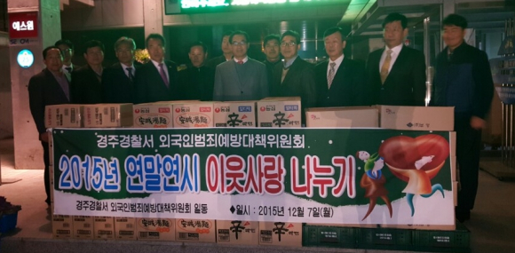 경주경찰서(서장 오병국)은 지난 7일 18:00경 연말연시를 맞아 외국인범죄예방대책위원회(회장 문봉만)와 함께 다문화가정‧장애인‧한부모 세대 등 지역 소외계층 15가구를 찾아 쌀과 생필품을 전달하고, 한해동안 지역내 외국인 범죄예방과 사회정착 지원 활동을 펼쳐온 외국인범죄예방대책위원회의 화합과 결속력을 돈독히 하기 위해 ‘송년의밤’ 행사를 가졌다.
