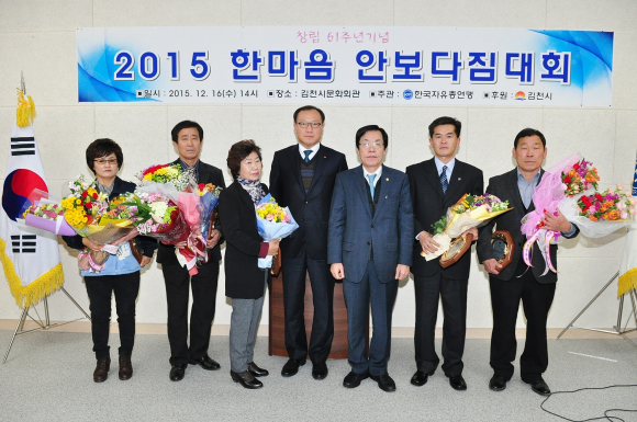 김천시(시장 박보생)는 지난 16일 김천시문화회관 소강당에서 100여명이 참석한 가운데 한국자유총연맹 김천시지회(지회장 김용대) 주관으로 ‘2015 한마음 안보다짐대회’를 개최했다.