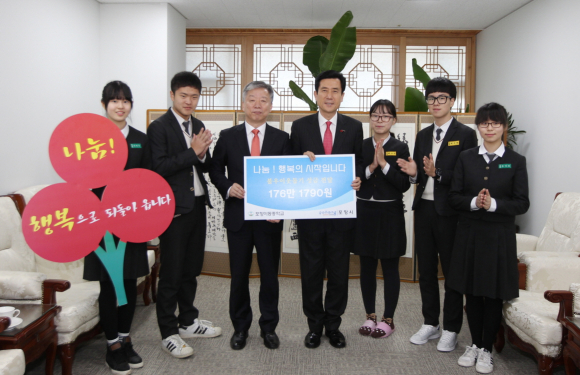 포항이동중학교(교장 최봉식) 학생회가 21일 포항시청을 방문해, 학교 축제시 바자회를 개최해 마련된 수익금을 어려운 이웃에게 전달해 달라며 1,761,790원을 기탁했다.