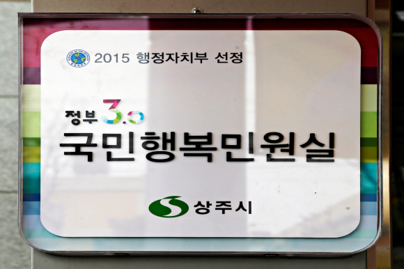 상주시는 행정자치부로부터 국민행복민원실 우수기관으로 선정되어 21일 시청 종합민원실에서 이정백 상주시장을 비롯해 명예민원실장, 민원모니터임원 등 20여 명이 참석한 가운데 현판식을 가졌다. 상주시는 그동안 시민편의를 위해 종합민원실에 북카페, 실내정원, 수유실, 어린이 놀이방, 휴게공간 등을 조성하여 편안함을 제공하고 있으며 특히, 시민참여 열린민원실(1일 명예민원 실장제)운영으로 민원제도와 민원실 환경을 개선한 점을 높이 평가받아 전국 240여개 자치단체를 대상으로 실시한 국민행복민원실 평가에서 정부3.0 국민행복민원실로 선정됐다.
