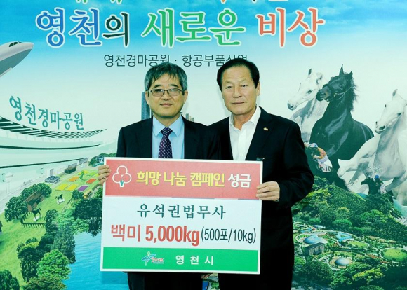 지금까지 성금품을 보내주신 고마운 분들을 살펴보면 유석권법무사에서 백미550kg(1천2백만원상당)을 시작으로 ㈜승원친환경기술(1천1백만원), ㈜골프존카운티청통(1천만원), ㈜명활(6백만원), ㈜구국토건(3백만원), ㈜동부레미콘(3백만원), ㈜대영산업(2백5십만원), ㈜건우금속(2백만원), ㈜한호산업(2백만원), ㈜동일금속(2백만원), ㈜화인시스템(1백만원), ㈜고은힐즈(1백만원), ㈜영천교통(1백만원), ㈜영동기업(1백만원), ㈜피플데이타(1백2십만원), ㈜화인(1백만원), 본촌주유소(1백만원),경북농장(1백만원),s-oil(주)영천주유소(1백4십만원), ㈜대아아스콘(1백만원), 북안종합건재(1백만원), 대흥농장(1백만원), 석계특장(1백만원), 청통면 미래농장(1백만원), 서부동 정약국(1백만원), 고경식육점(1백만원), 남면이칠회(1백만원), 남부동 유근태氏(1백만원) 등 지역의 각 기업체 및 시민들의 나눔성금이 연일 이어지고 있으며,