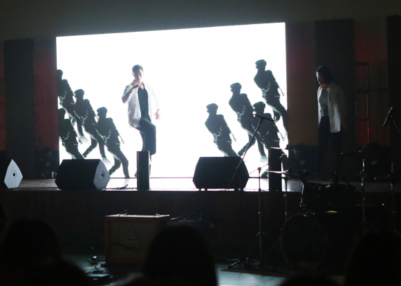 극장 문이 열리자 사람들이 쏟아져나오고 피부에서 붉은빛이 번져