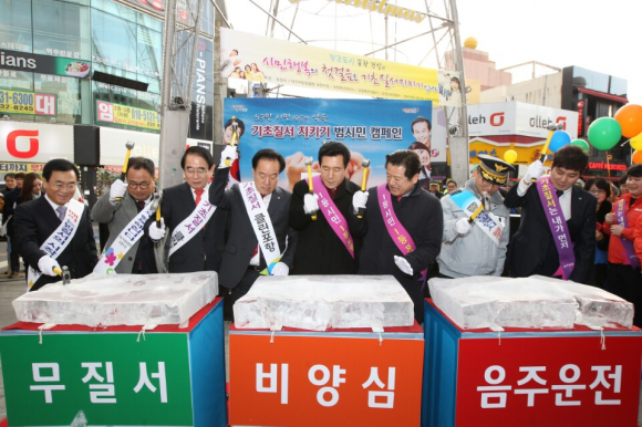 특히 시민화합을 위한 노래공연과 풍물놀이에 이어 시민 대표로 포항청년회의소 진승하 상임부회장이 기초질서와 교통안전 준수를 위한 4대 실천 결의문을 낭독했고, 악습타파 퍼포먼스에서는 기초질서를 저해하는 대표적인 악습인 ‘비양심’, ‘무질서’, ‘음주운전’을 타파하자는 의미에서 얼음을 깨고 시민 모두가 약속실천을 위해 힘차게 다짐의 구호를 외쳤다. 또한 거리캠페인에서는 600여명이 넘는 참가자들이 중앙상가 실개천 거리와 남빈사거리, 구 포항역 구간을 걸으며 상인과 시민들을 대상으로 홍보전단을 배부하고 ‘지킬수록 기분 좋은 기본’, ‘배려와 양보는 최고의 미덕입니다’ 등의 피켓과 현수막, 기초질서 지키기 문구가 담긴 오색풍선을 들고 행진해 장관을 이뤘다.