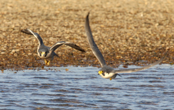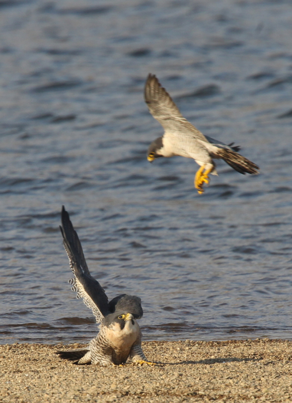 국제적으로 보호를 받고 있는 ‘매(천연기념물 323-7)’ 두 마리가 포항시 남구 연일읍 형산강에서 먹잇감을 찾으며 휴식을 취하고 있다.