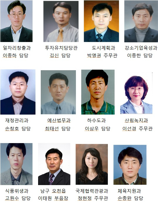 <분야별 수상내역: 6개 분야 12명> ▣ 지역경제 활성화(2명) 강림중공업의 대형 조선블럭 이송 문제 해결 등 기업애로사항을 솔선 해결하는데 노력한 일자리창출과 이종하 담당과 해외 기업 투자유치 등 투자유치에 적극 기여한 공을 인정받아 투자유치담당관 김신 담당이 선정됐다.