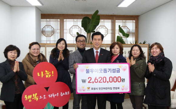 포항시 민간어린이집 연합회(회장 이근욱)가 연말연시를 맞아 지난 17일 포항시청을 방문해 소외계층을 위한 이웃돕기 성금 2,620,000원을 전달했다. 민간어린이집 연합회는 184개의 어린이집이 회원으로 구성돼 지역 영유아 보육 발전에 기여하고 있으며, 매년 어려운 이웃을 위한 성금을 포항시에 지원해오고 있다. |