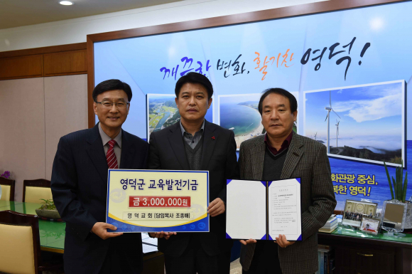지난 24일 매년 어려운 이웃을 위해 봉사활동을 활발히 펼치고 있는 영덕교회(담임목사 조종배)가 재단법인 영덕군교육발전위원회(이사장 이희진 영덕군수)를 방문하여 지역 학교 발전과 인재 양성을 위해 사용해달라며 교육발전기금 3백만원을 기탁했다.