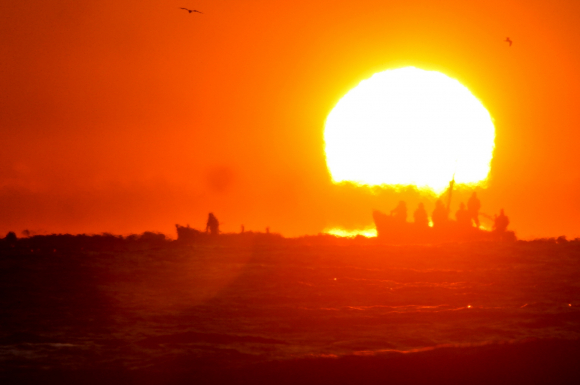 포항시 남구 구룡포 연안에서 어획 중인 어선 뒤로 붉은 해가 떠오르고 있다.