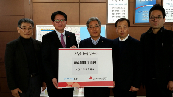 포항지역건축사회(회장 최요명)는 6일 포항시청을 방문해 회원들이 모은 불우이웃돕기 성금 400만원을 어려운 이웃에 전달해 달라며 포항시에 기탁했다. |