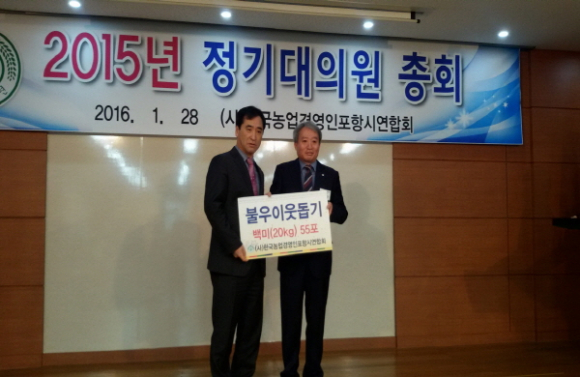 이날 농업경영인회원 자녀 중 학업 성적이 우수한 학생에게 120만원(1인당 20만원)의 장학증서 및 장학금을 전달했으며, 관내 불우이웃을 위해 백미(20kg) 55포를 포항시에 기탁했다. |