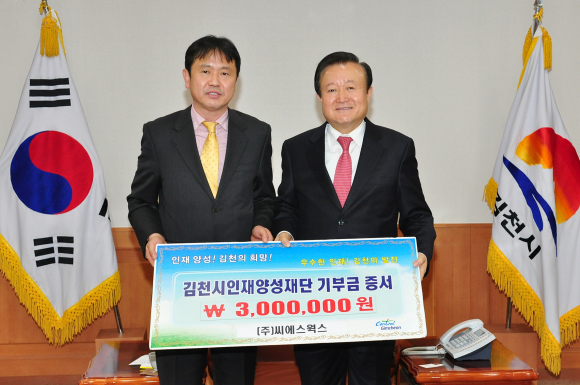 |  | | | ⓒ GBN 경북방송 | | 김천시 미래를 위한 우수인재육성과 김천교육발전을 위해 조성 중인 김천시인재양성재단(이사장 박보생)에 (주)씨에스웍스(대표이사 윤준희)에서 1일 오후 김천시청을 방문하여 장학기금 3백만원을 기탁했다.