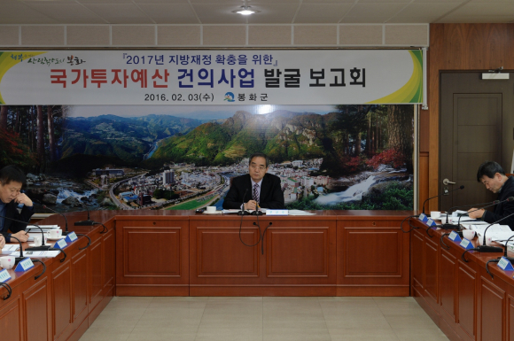 봉화군(군수 박노욱)은 3일 군청 소회의실에서 2017년 국가투자 건의사업 발굴 보고회를 개최하고 지방재정 확충과 지역현안사업의 차질 없는 추진을 위한 국비예산확보에 본격적인 시동을 걸었다.