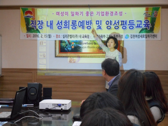 김천시 평생교육원내 여성새로일하기센터(센터장:김금숙)에서는 2. 15(월) 여성친화적 기업문화 확산을 위한 직장 내 양성평등 및 성희롱 예방교육을 실시하였다.
