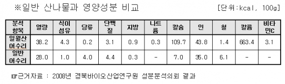 3월 중순경부터 본격적인 수확을 시작하는 일월산 자락에서 자란 영양 어수리는 그 맛과 향이 진해 전국에서도 최고의 품질을 자랑한다. 또한, 일월산 어수리는 열량, 식이섬유, 지방, 나트륨, 칼슘, 인, 칼륨, 비타민C가 일반 산나물보다 높으며, 특히 식이섬유는 4.2배, 칼슘은 15.7배 나 높다. |  | | | ⓒ GBN 경북방송 | |