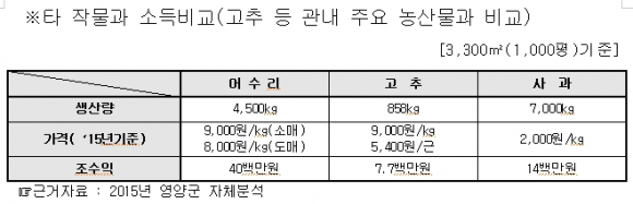 현재 영양군에서는 영양읍 1농가, 일월면 8농가 등 9농가에서 39,610㎡정도 어수리를 재배하고 있으며 그 재배 농가 수는 점차 늘어나는 추세다.