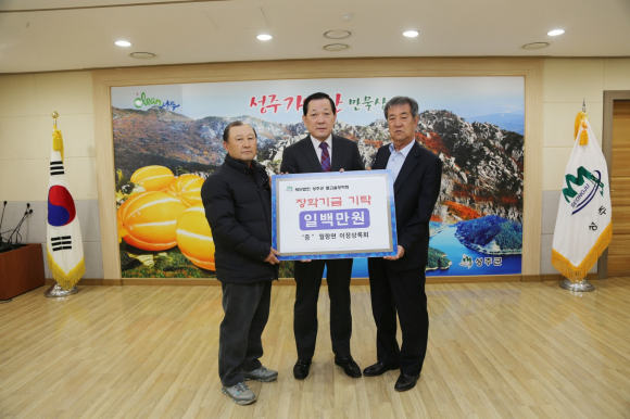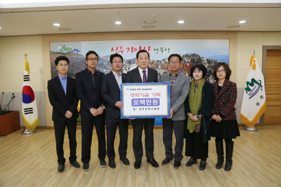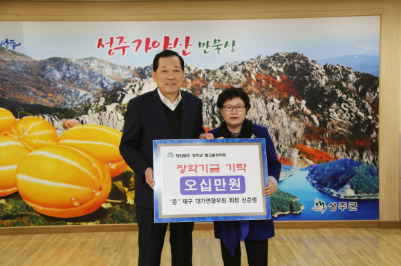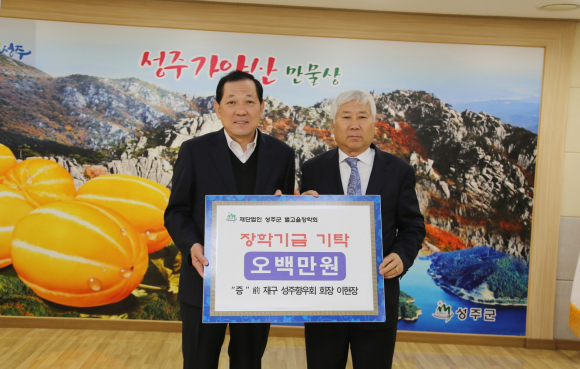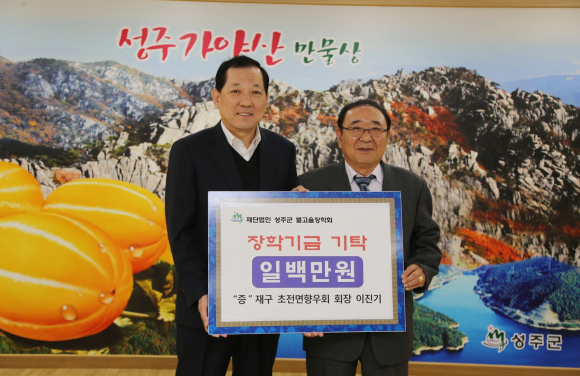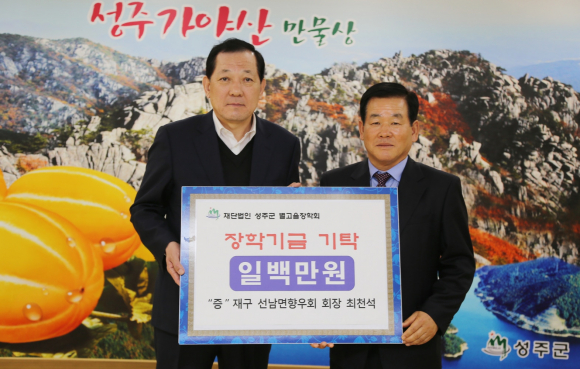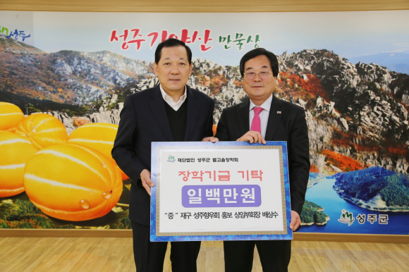 前 재구 성주군향우회 회장 이현장 5,000,000원, 재구 성주군향우회 대외홍보 상임부회장 배상수 1,000,000원, 재구 성주군향우회 여성 상임부회장 이옥희 500,000원, 재구 선남면향우회 회장 최천석 1,000,000원, 재구 용암면향우회 회장 박노경 1,000,000, 재구 대가면향우회 회장 신춘생 500,000원, 재구 초전면향우회 회장 이진기 1,000,000원, 성주건축사협회 5,000,000원, 계림건축사사무소 대표 서정영 3,000,000원, 월항면 이장상록회 1,000,000원, 월항면 한울림풍물패 1,000,000원을 (재)성주군별고을장학회에 기탁했다.