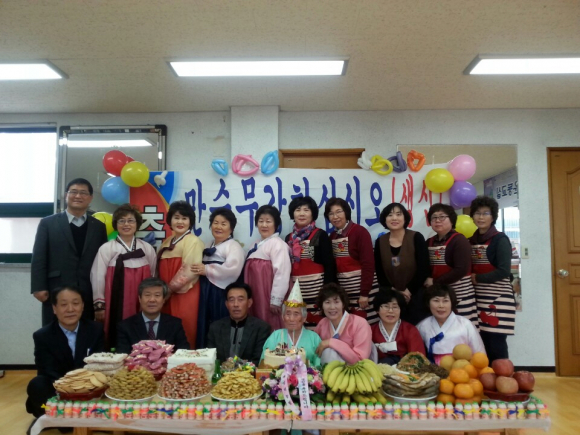 이날 생신상은 병곡면사무소, 북영덕농협, 농가주부회, 백석2리 주민들의 동참 속에서 농가주부회원들이 정성껏 준비한 음식으로 차려졌다. 마을 주민들과 함께 큰 절을 올리고 축가와 케익 절단, 마음에 담은 선물 전달 순으로 이어지며 어르신의 건강을 기원했다.