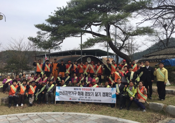 김천시(시장 박보생)는 4월 6일 증산면 평촌리에서 김천소방서, 안전모니터봉사단원들과 함께 농촌지역의 생활안전을 담보하기 위하여 80가구에 화재경보기 달아주기 행사를 진행했다.