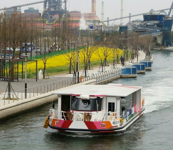 포항시가 지난해 11월 포항운하 주변에 파종했던 유채꽃이 만발해 포항운하를 찾는 관광객들에게 청량감과 아름다운 경관을 제공하고 있다.