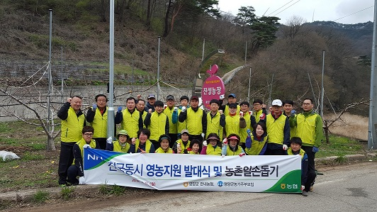농협영양군지부(지부장 이 준)는 4월11일 관내 농협임직원 및 농가 주부모임 회원 등 30여명이 참가한 가운데 영양읍 무창리 농가를 방문 전국동시 영농지원 발대식 및 복숭아 꽃잎따기 농촌사랑 일손돕기 행사를 가졌다. 본격적인 영농철을 맞아 농업인 고령화와 농촌인구의 감소에 따라 영농에 많은 어려움을 겪고 있는 농업인들을 지원하기 위해 4월 11일 전국 농협이 일제히 「범농협 전국동시 영농지원 발대식 및 농촌일손돕기」를 실시하였다.