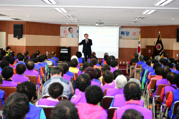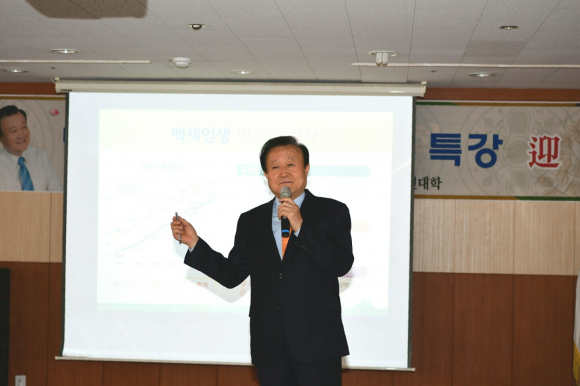 최근 가장 핫한 대중가요인 이애란 가수의 “백세인생”이란 노래를 부르며 시작된 특강은 평균수명의 상승으로 2025년에는 100세 시대를 맞이하게 됨을 역설하면서 시에서 추진하고 있는 어르신 관련 사업들을 소개하는 순서로 진행됐다.