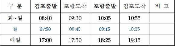 운항노선 및 횟수 : 김포-포항/1일 2회 4편