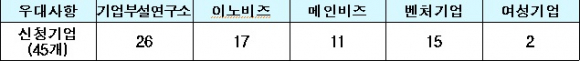 올해 신청한 기업은 평균 매출액 76억원, 기업부설연구소 26개사, 이노비즈 17개사, 메인비즈 11개사, 벤처기업 15개사, 여성기업이 2개사 등으로 집계됐다.